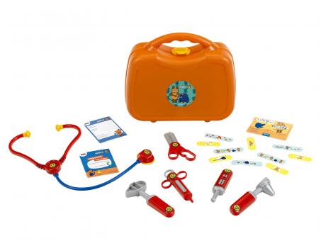Der Arztkoffer enthält alles, was kleine Ärztinnen und Ärzte für die Behandlung ihrer Patienten brauchen: Stethoskop, Thermometer, Reflexhammer, Spritze, Ohrenspiegel, Schere, Pflaster (10 Stück in 2 Größen mit vielen verschiedenen Motiven), Erste-Hilfe-Tipps und eine Rezeptkarte.
