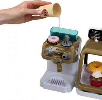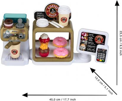 Der hübsche Coffee Shop hat nicht nur ein modernes Touchdisplay für Bestellungen, sondern auch ein Kartengerät mit Soundfunktion. Die Espresso-Bar mit auffüllbarem Wassertank und Wasserdurchlauffunktion begeistert die Nachwuchs-Baristas, ebenso wie das umfangreiche Zubehör: eine EC-Karte, zwei steckbare Cupcakes, zwei steckbare Donuts, zwei Kaffeebecher mit Deckel, zwei Portafilter, drei Kaffeepads, zwei Kaffeestempel und zwei Zuckerbeutel.