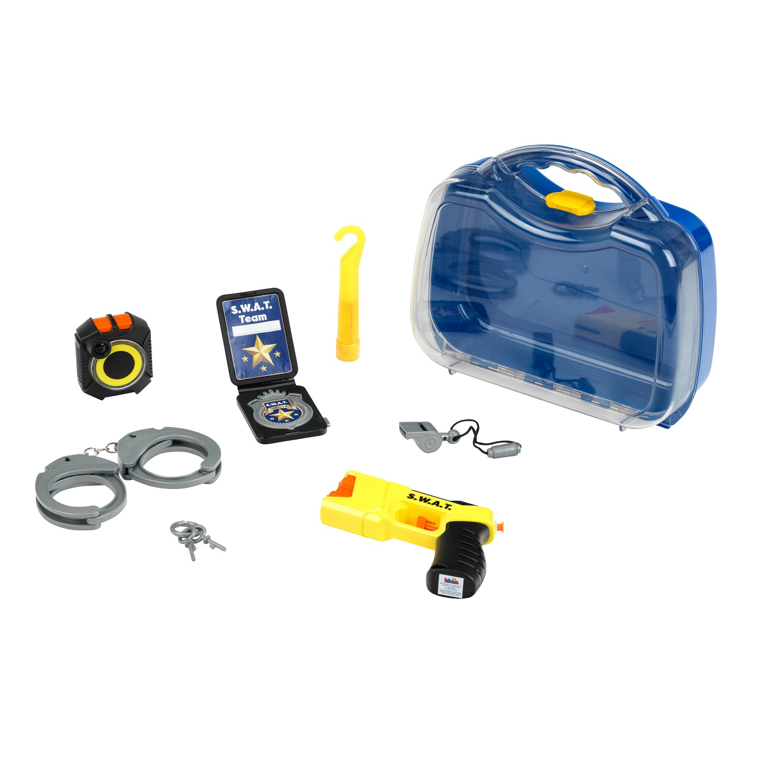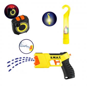 Der Koffer enthält eine Vielzahl an realistischer Ausrüstung für kleine Agenten: einen Taser mit Wasserspritzfunktion, eine Body Cam mit Licht & Sound, einen Spezial-Ausweis, eine Trillerpfeife, einen LED-Haken (ohne Batterien) und Handschellen mit Schlüssel. Ideal für actionreiche Spielstunden!