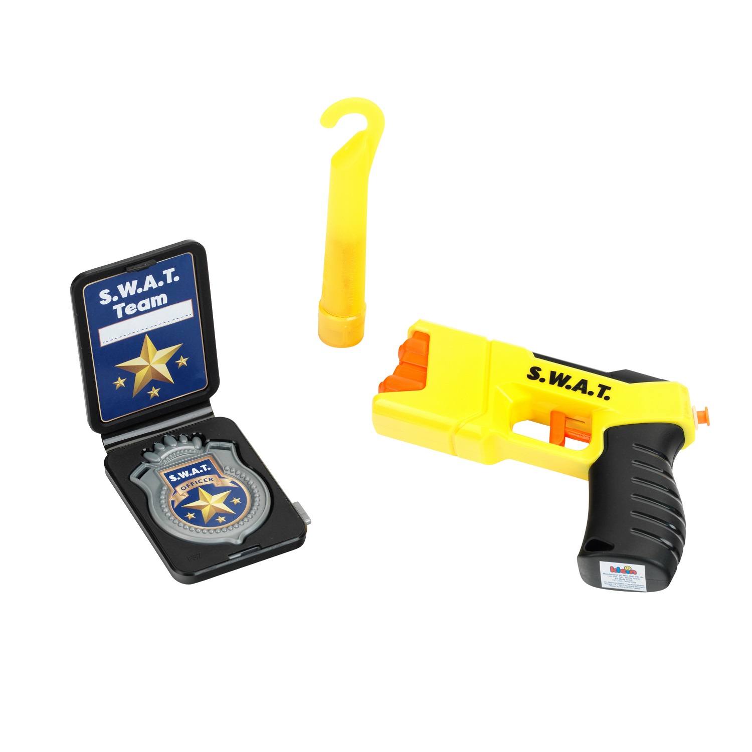 Das S.W.A.T. Mini Set enthält alles, was junge Helden brauchen: ein aufklappbarer Ausweis, ein LED-Haken und eine Watergun. Das Set lässt sich ideal in Rollenspiele einbinden und regt die Fantasie an.
