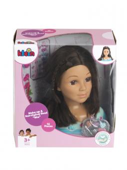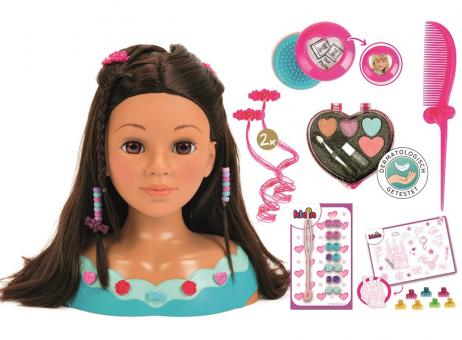 Zum hübschen, 27 cm hohen Frisierkopf für Kinder mit wasch- und kämmbarem Haar gehört ein dermatologisch getestetes Kosmetikset in Herzform und Haarschmuck. Im Kosmetikherz enthalten sind Lipgloss, Lidschatten und Rouge. Als Haarschmuck und Frisierutensilien gehören eine Bürste, ein Kamm, zwei Haarsträhnen, ein Haarperlenset, sieben Haarclips, zwei Barette-Clips, acht Deko-Pins für den Torso und Barette-Clips sowie ein Stickerbogen, eine Anleitung mit Stylingtipps und vieles mehr.