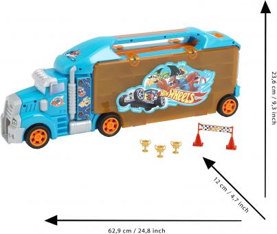 The sturdy case with integrated ramp offers storage compartments for up to 24 cars and two trucks on a scale of 1 to 64 (toy vehicles are not included). It can be taken anywhere with the practical handle. The equipment also includes two pylons, three cups and a target sign.